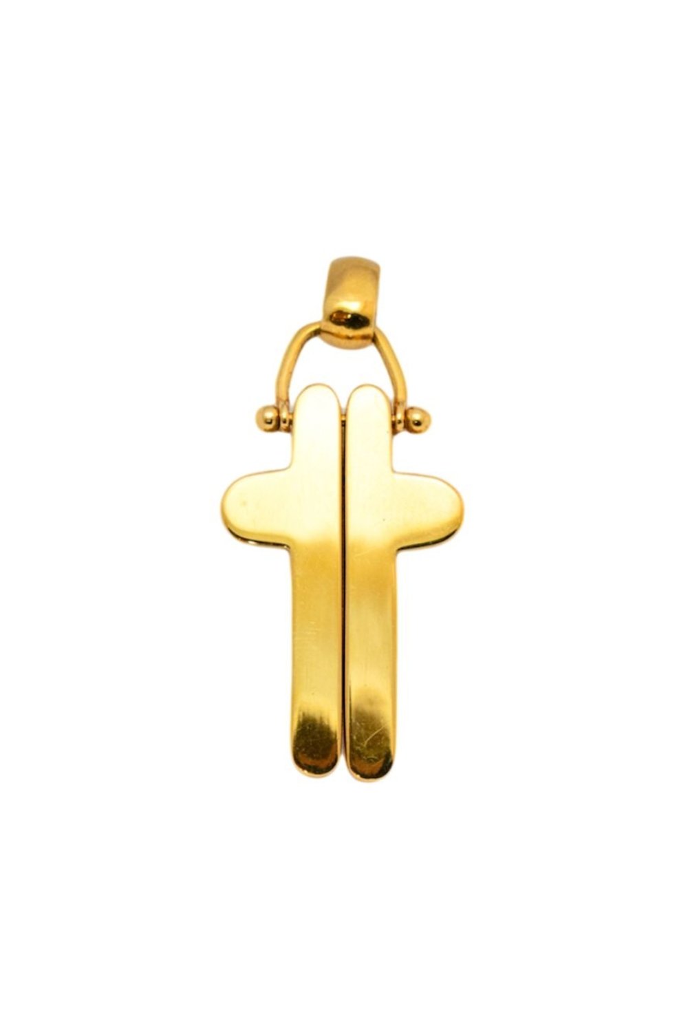 Cruz muy original formada por una doble asa y la dicha cruz esta partida, pero aun así las dos partes formas parte de la misma. En oro amarillo de 18 qts.