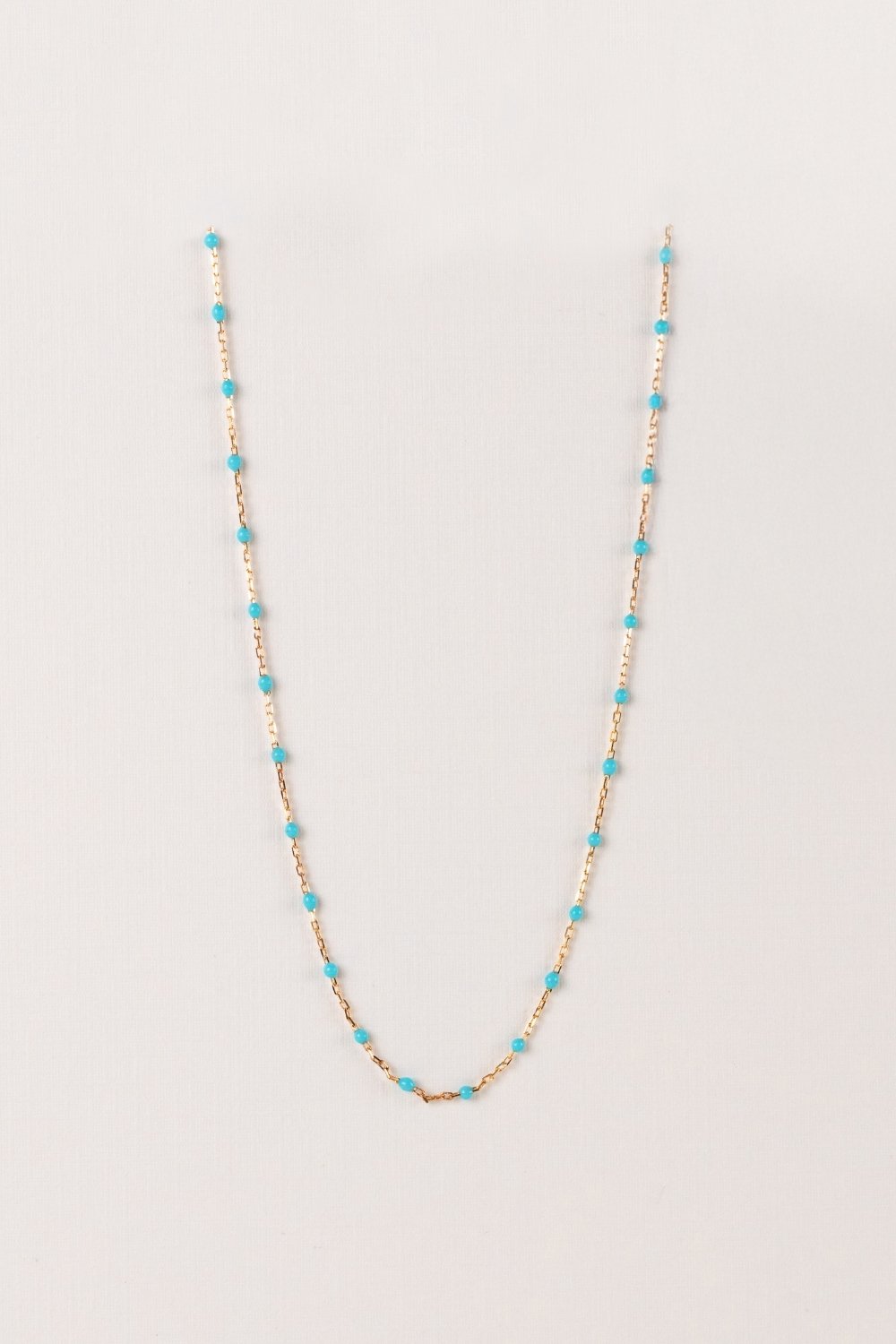 Gargantilla formada por una cadena fina de oro amarillo de 18 qts, donde hay bolitas muy pequeñas con esmalte en azul celeste. Pertenece a la colección Matisse.