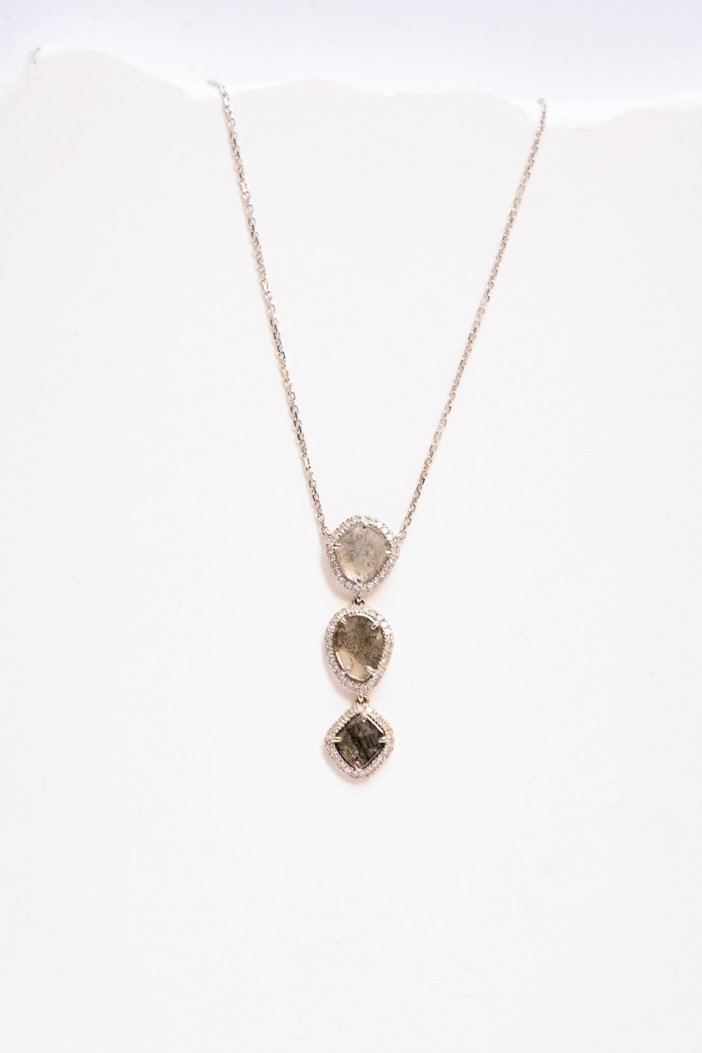 Gargantilla en oro blanco de 18 qts con tres orlas de brillantes de distintas formas y un diamante gris en cada una de ellas. Colección Indo.