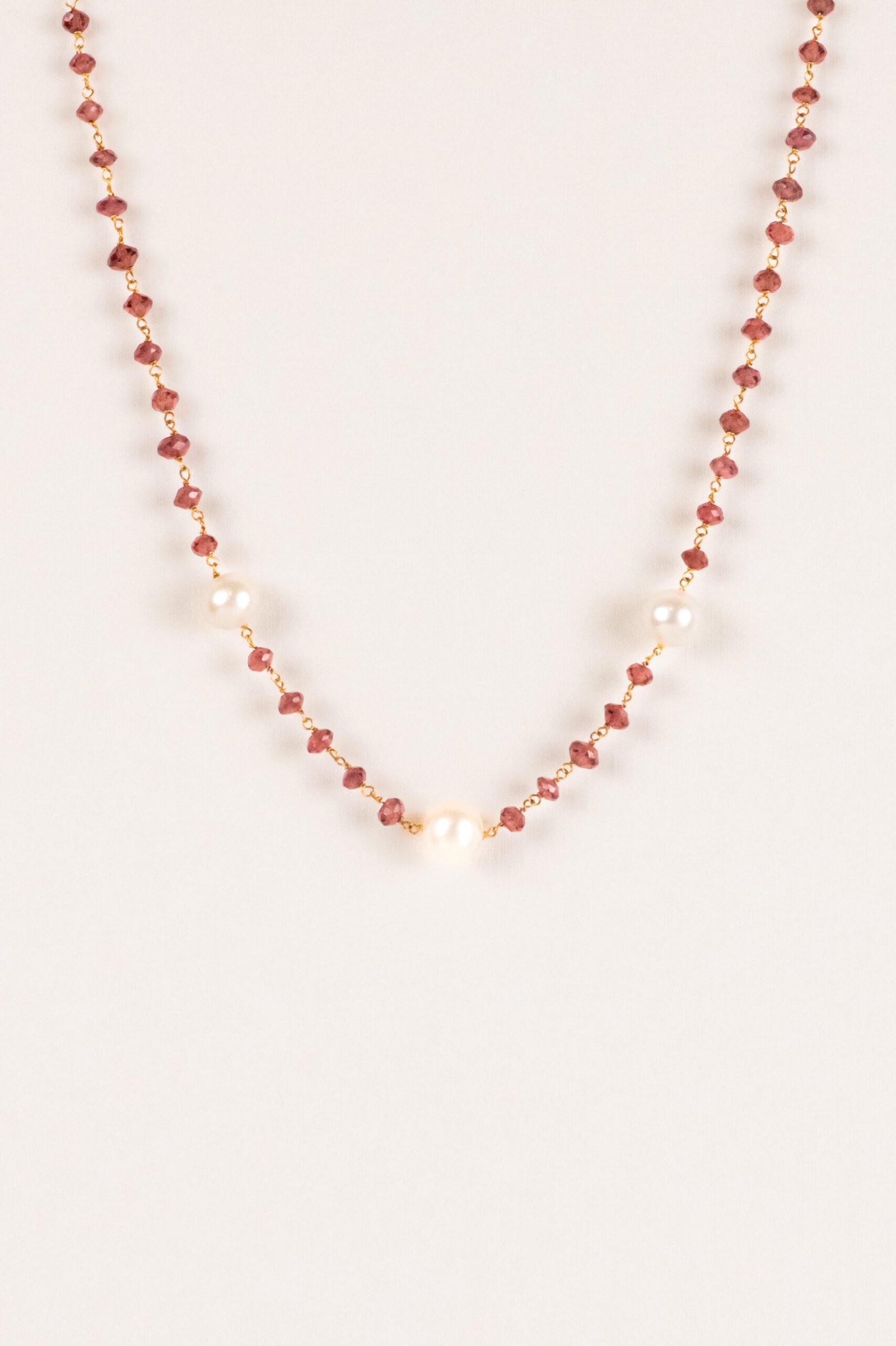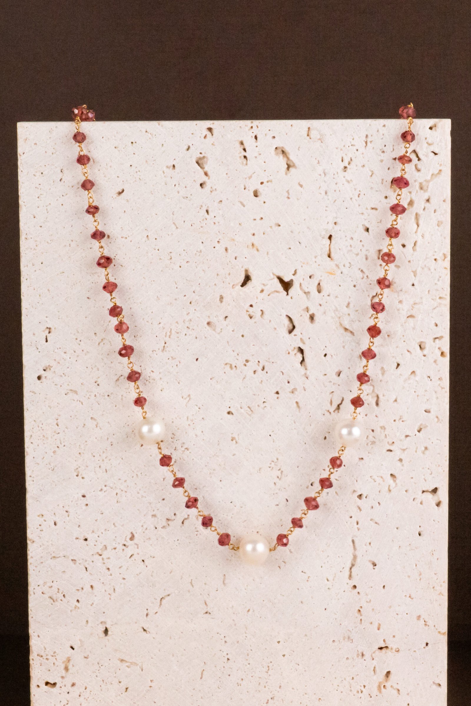 Gargantilla de unos 40 cm formada por una serie de piedras pequeñas de color rojo oscuro, llamadas Granates, con cierre y detalles en oro amarillo. Su centro está formado por tres perlas blancas cultivadas.