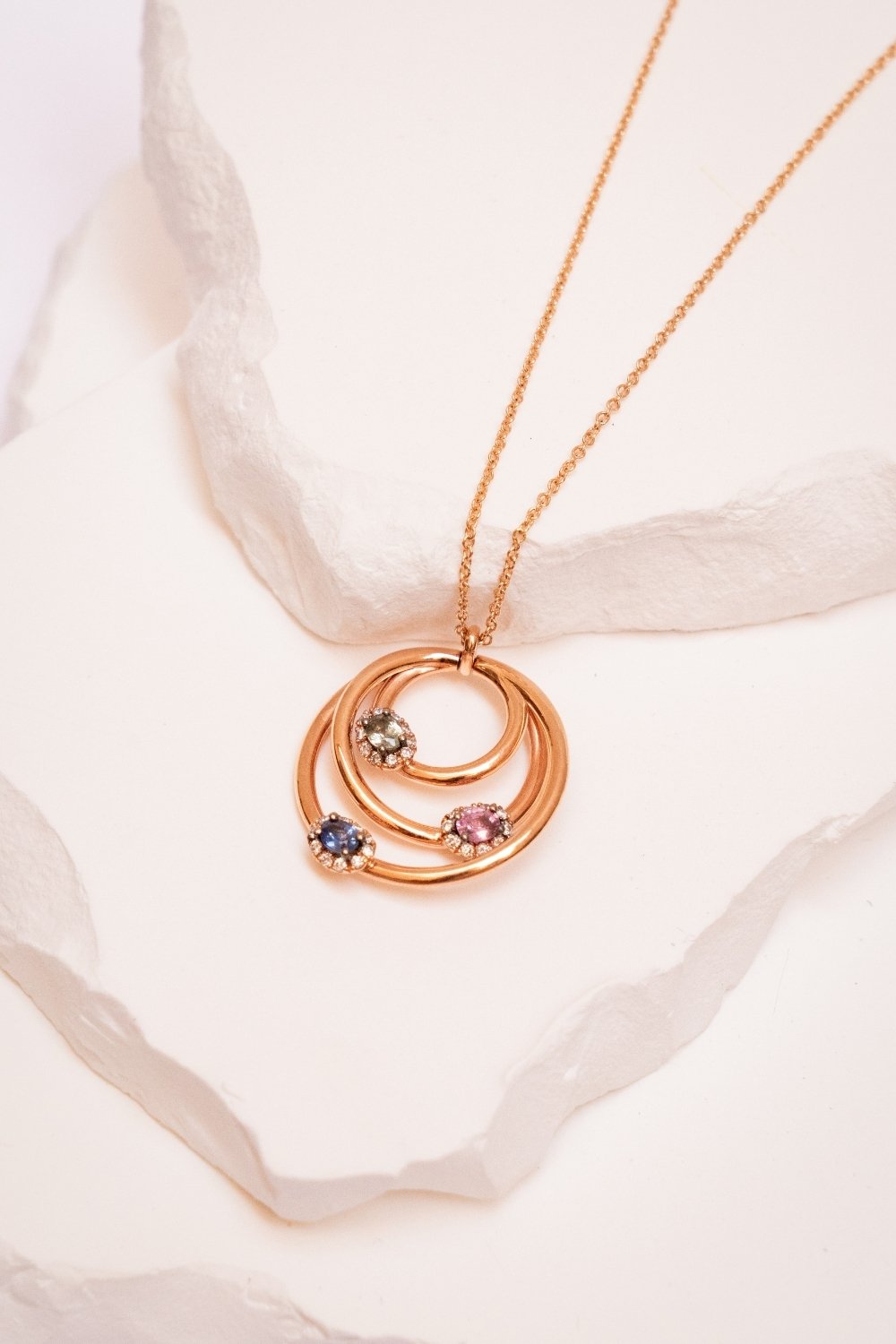 Collar formado por colgante y cadena en oro rosa de 18 qts con tres orlas de brillantes y piedras finas de color en verde, azul y rosa. PIEZA ÚNICA.
