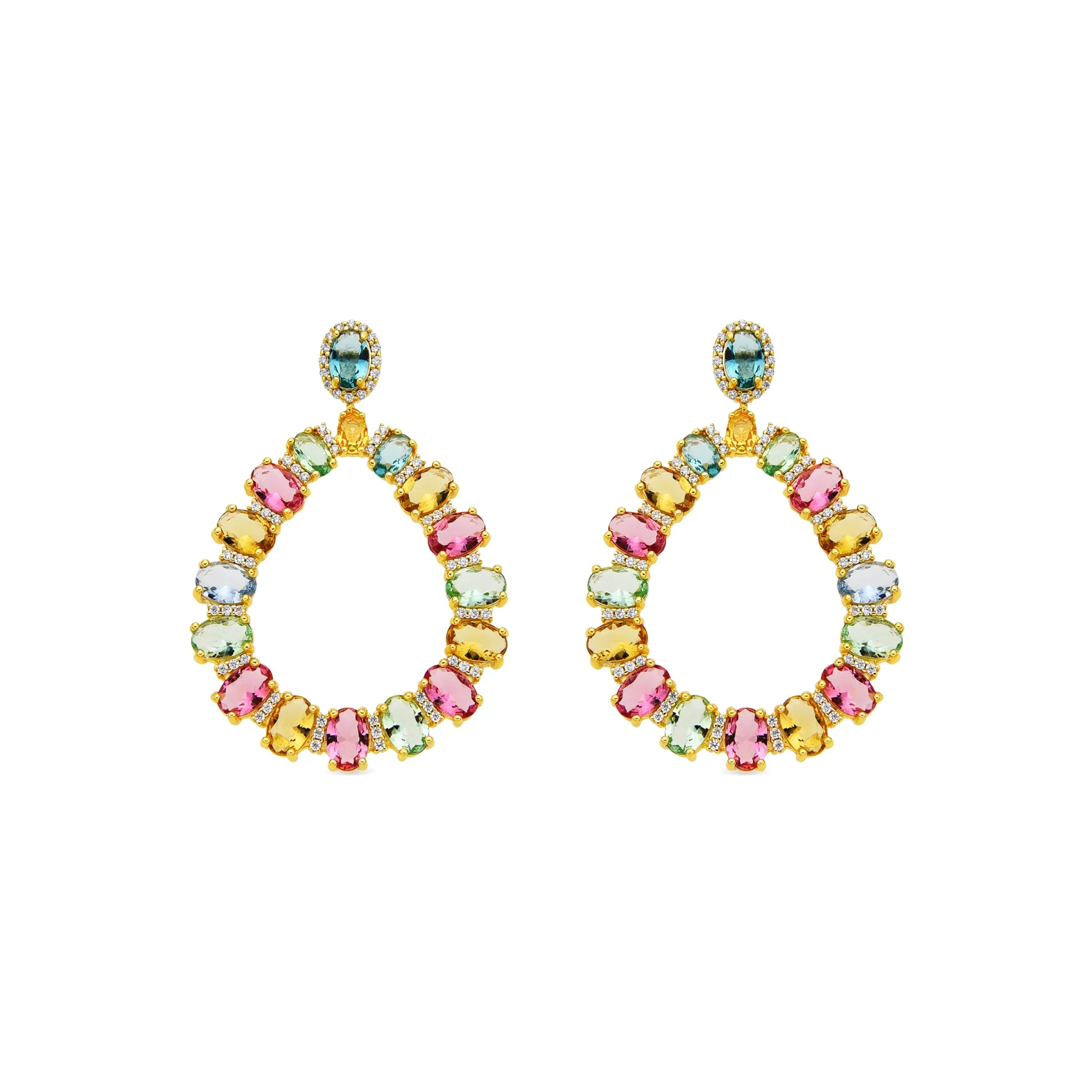 Pendientes largos en plata de ley con acabado dorado formando dos coronas de piedras finas en multitud de vivos colores.