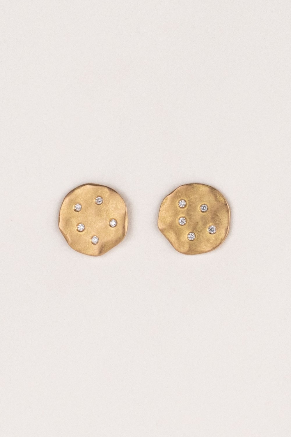 Pendientes en oro amarillo de 18 qts efecto matte, planos y con brillantes pequeños. Colección Indo.