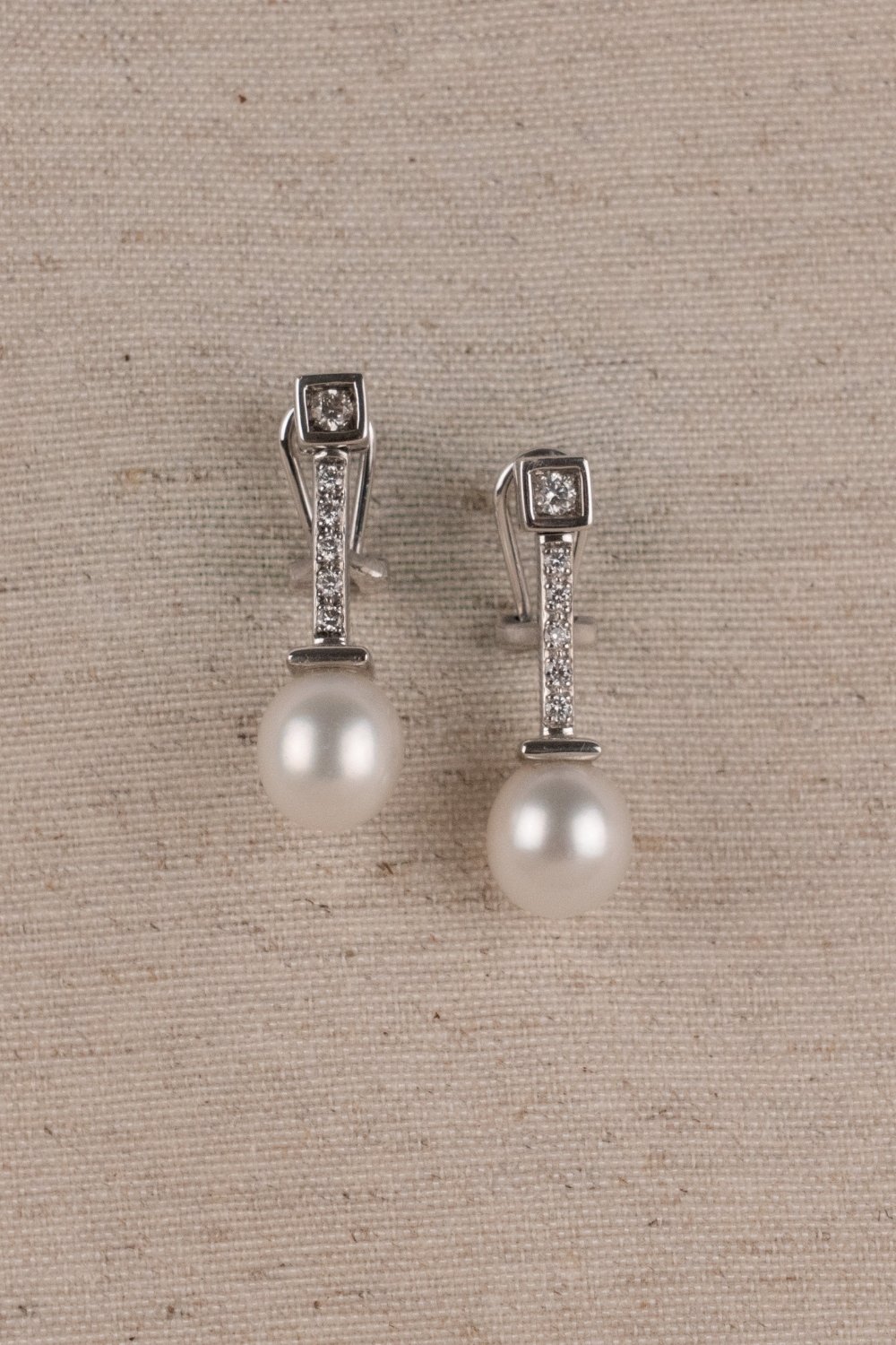 Pendientes en oro blanco 18 qts., diamantes y perlas australianas.