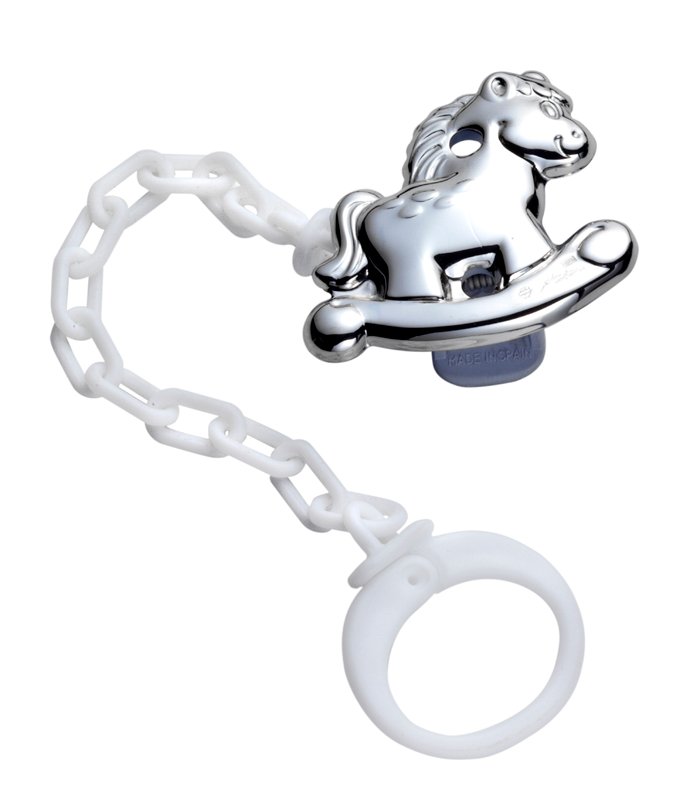 Pinza para chupete en plata de ley 295 con la forma de una caballito balancín.