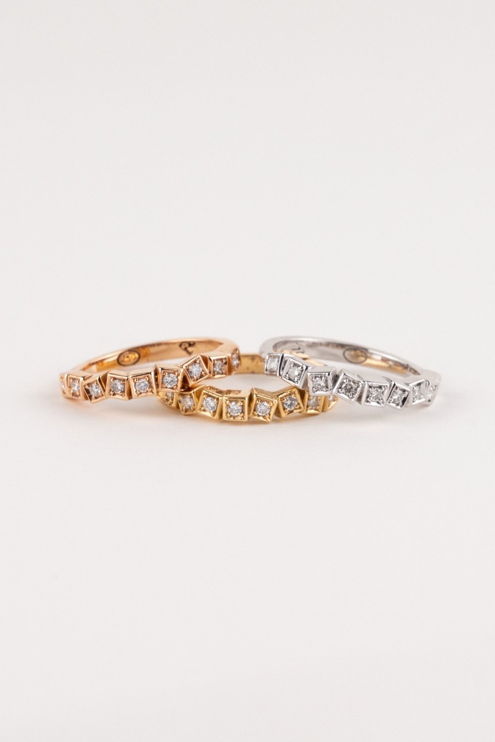 Media alianza de la colección «Indo» en oro amarillo 18 qts. y diamantes engastados en cuadrados descolocados.