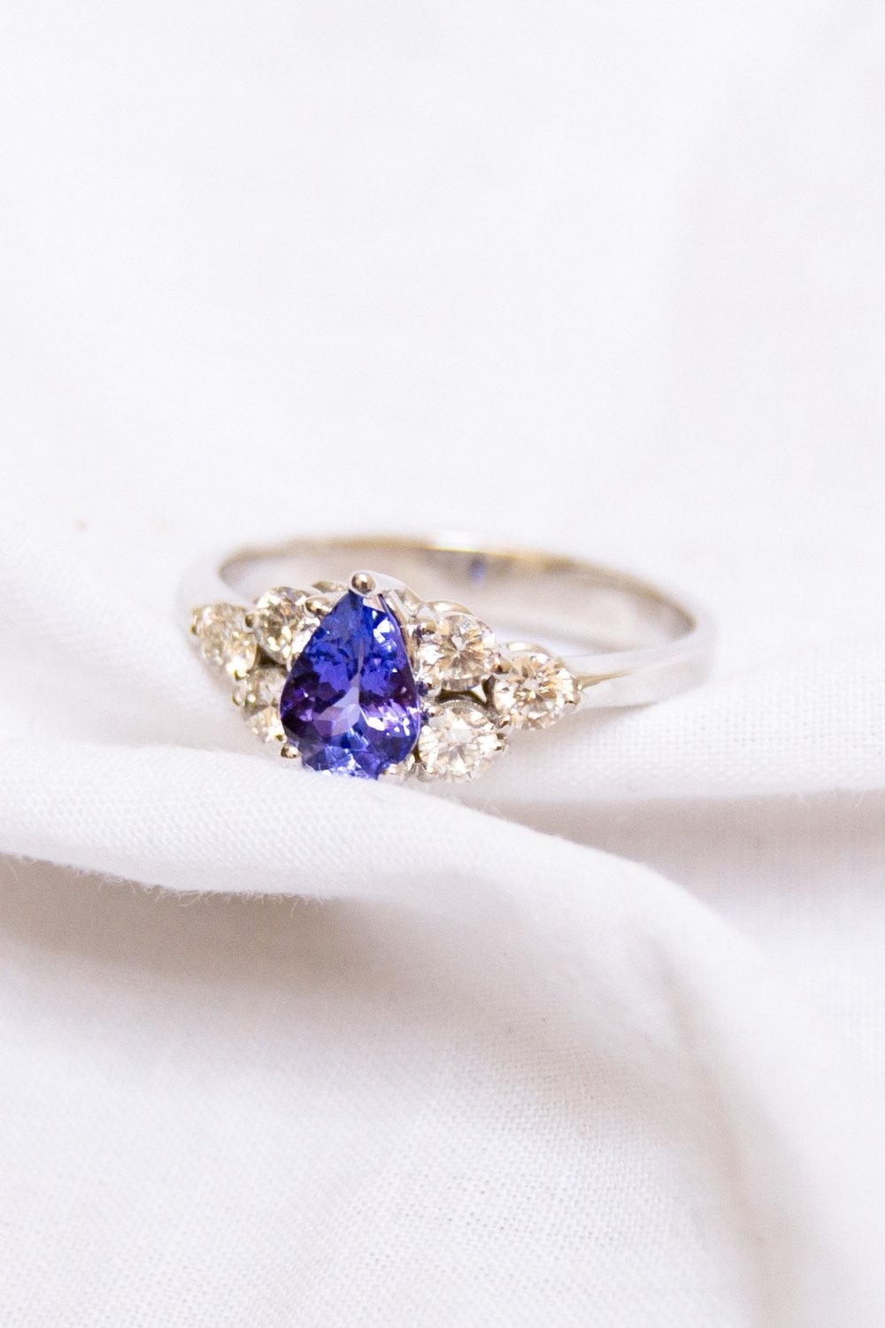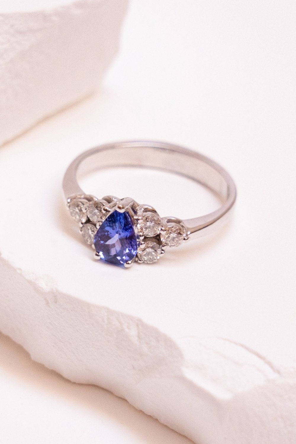 Sortija en oro blanco 18 qts. con espectacular tanzanita en talla pera y seis diamantes engastados divididos en tres a ambos lados.